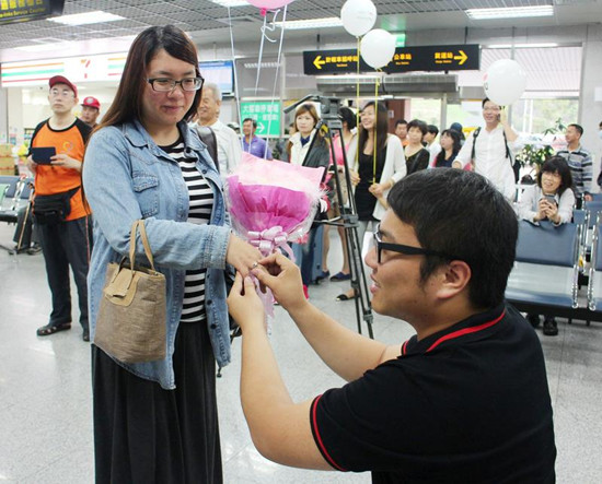 中新網(wǎng)5月29日電 據(jù)臺灣“中央社”報道,金門文創(chuàng)商品“風伯燒”的老板王家進,28日在機場捧著白色花菜,向交往5年的女友郭佑偵求婚。