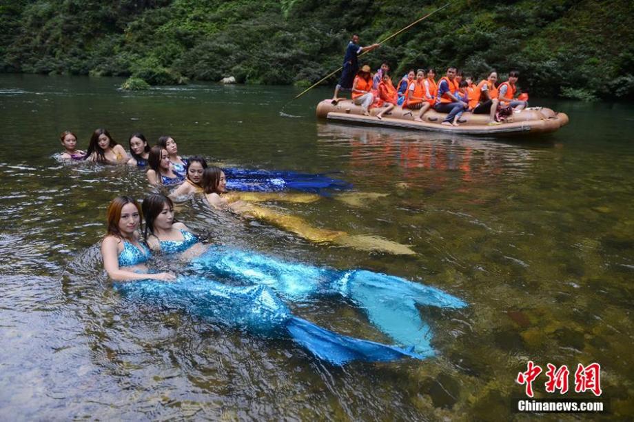 8月4日,湖南永順猛洞河“美人魚”游泳教學(xué)開班,眾多喜愛游泳的美女化身“美人魚”,在水中暢游、嬉戲。她們妙曼的身姿和閃亮的美人魚服裝,吸引了許多漂流者的目光。楊華峰 攝