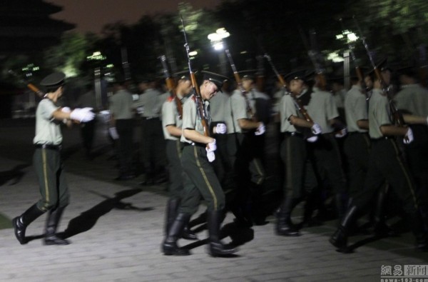 2010年8月31日,北京,負(fù)責(zé)天安門升降國旗的武警在夜間進(jìn)行日常訓(xùn)練。
