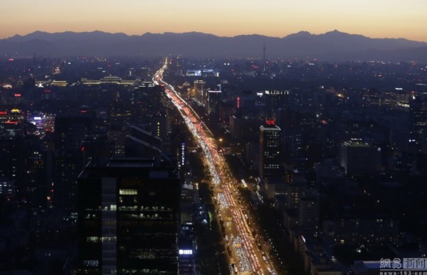 2014年9月3日,北京,日落時分,道路上車水馬龍。