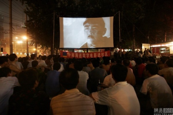 2007年6月6日,夜里的朝陽路上,上百農(nóng)民工在一個工地附近觀看關(guān)于抗日戰(zhàn)爭的露天電影。