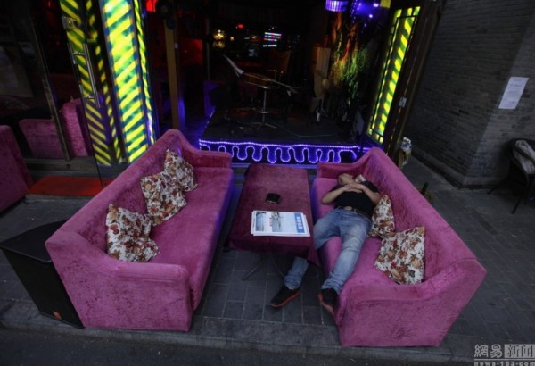 2012年8月23日,北京,一名員工在后海酒吧門前的沙發(fā)上睡覺。