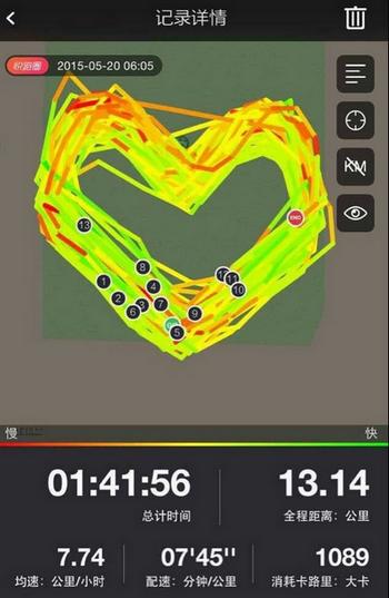 昨晚7時(shí)30分,20余名來自全市各地的白領(lǐng)陸續(xù)來到軌道交通10號線伊犁路站,找了一個(gè)公廁,他們脫下襯衫皮鞋的工作裝,換上戴著反光條的運(yùn)動裝,開始了最讓他們忘記朝九晚五疲憊的一項(xiàng)微信朋友圈活動:約跑。昨天是七夕,他們的跑步路線也別出心裁——晚上9時(shí)30分,活動召集者、IR跑團(tuán)帶頭人“木子”手腕上的智能手環(huán)顯示:夜跑路程13.14公里,寄托著“一生一世”的美好寓意,而且,他們的路線恰好在地圖上“畫”出一個(gè)英文單詞“LOVE”,讓夜跑族里的四對情侶感到,相比玫瑰、大餐,這是送給彼此更好的禮物。
