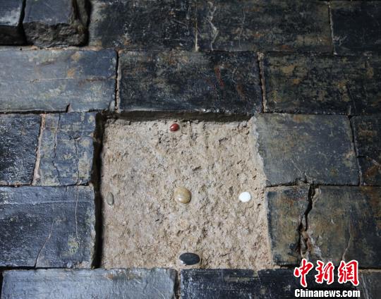 此外,在棺床中部,還發(fā)現(xiàn)了一個(gè)金井,呈正方形,邊長(zhǎng)40厘米,深6厘米,中間擺放著五種顏色的鵝卵石,其中,黑、紅、青、白四色分別放置于金井的北、南、東、西四個(gè)方向,中間一顆為黃色,體積略大于其它四顆,這樣的“五色石陣”意義何在,要等待史學(xué)專家的解釋。