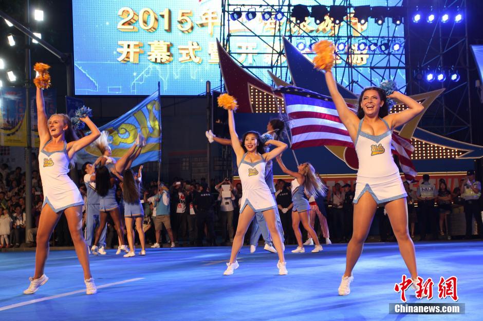 9月12日晚,上;春B妨鞴庖绮剩26屆上海旅游節(jié)拉開帷幕。來自19個(gè)國(guó)家和地區(qū)的23輛花車和31支表演方隊(duì),圍繞著“海上絲路”這一主題,全方位地展示“一帶一路”沿線城市和地區(qū)的風(fēng)采。圖為美國(guó)加州大學(xué)洛杉磯分校(UCLA)啦啦隊(duì)表演隊(duì)亮相。 張亨偉 攝