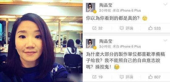 [摘要]陶晶瑩在微博發(fā)文稱:“為什么大部分的制作單位都喜歡準備稿子給我?操控鬼!”似乎對某檔節(jié)目拍攝過程有不滿。