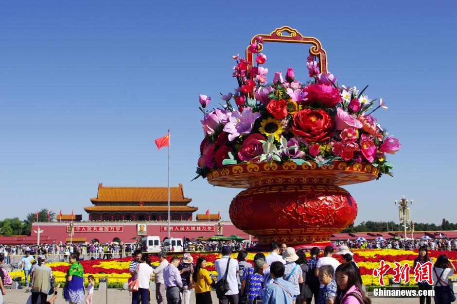 9月25日,北京天安門(mén)廣場(chǎng)大型國(guó)慶花籃“祝福祖國(guó)”正式亮相,迎接中華人民共和國(guó)成立66周年;ɑ@直徑40米,高16米,用花量8萬(wàn)余株,主花材由中國(guó)傳統(tǒng)十大名花牡丹、玉蘭、荷花、月季、梅花、水仙、蘭花、杜鵑、桂花和菊花,以及向日葵、百合等花卉組成,最大花卉直徑2.9米。 中新社記者 賈天勇 攝