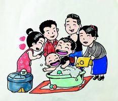 永軍和媳婦是高中同學(xué),媳婦是他們班里最好看的姑娘,性格也特別好。當(dāng)時,永軍就在心里默默放下狠話,將來一定要讓她出現(xiàn)在自己筆下的全家福中。就這樣,經(jīng)歷了八年愛情長跑的他們幸福地步入了婚姻的殿堂。從民政局領(lǐng)證回來后,激動的永軍將每年春節(jié)的傳統(tǒng)項目畫全家福提前了,連夜就奮筆疾書畫了起來。那張全家福里,披著大紅花的他背著漂亮的媳婦,笑得格外燦爛,而爸媽和弟弟則化身威風(fēng)鑼鼓隊成員,又是敲鑼又是打鼓,好不熱鬧。