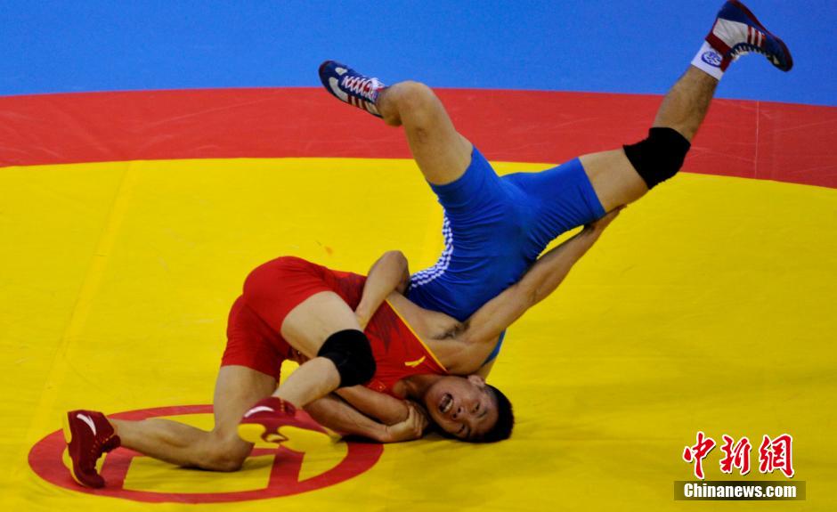 上圖為青運(yùn)會國際式摔跤男子自由式60公斤級決賽中,寧波市隊選手袁紹華戰(zhàn)勝呼和浩特市隊選手海日,奪得冠軍。 中新社記者 劉可耕 攝