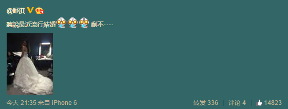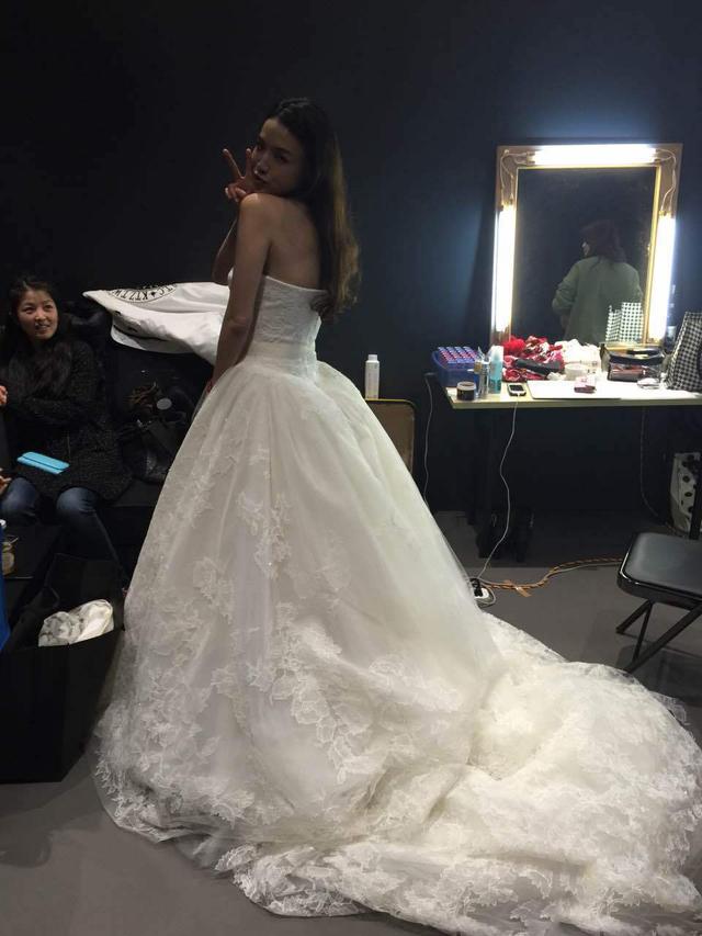舒淇在微博寫道:“聽說最近流行結(jié)婚,剩不 ”照片中,舒淇穿著白色露背款拖地婚紗,面對(duì)鏡頭比V賣萌。