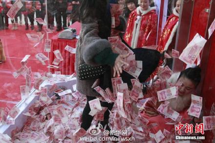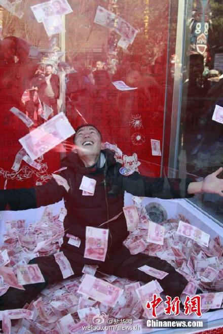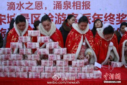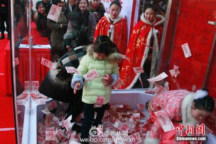 26日,杭州宋城景區(qū)給游客派發(fā)年終獎(jiǎng)。主辦方通過微信征集十位景區(qū)游客,在特定區(qū)域內(nèi)限時(shí)一分鐘,能抓多少帶走多少。最高一位來自衢州的陸小姐抓到18300元,成為當(dāng)天抓到最多年終獎(jiǎng)的游客。據(jù)悉,當(dāng)天現(xiàn)場(chǎng)現(xiàn)金共有五百萬元。