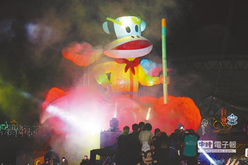 “旋轉(zhuǎn)大嘴猴”今晚將在臺(tái)中公園壓軸開(kāi)燈,以腳踩筋斗云的霸氣姿態(tài)現(xiàn)身,搭配360度旋轉(zhuǎn)及七彩燈光特效,猶如猴躍星空,意寓“立足臺(tái)中、放眼國(guó)際”。