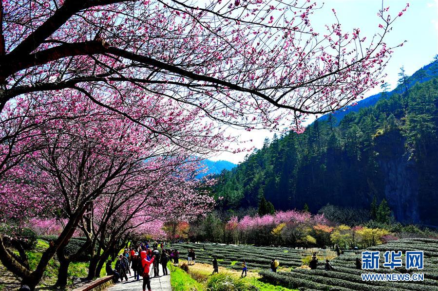 2月29日,游客在武陵農(nóng)場茶園觀賞櫻花。初春的臺灣,氣溫回升,位于海拔1700多米的臺中武陵農(nóng)場,漫山遍野的櫻花競相開放,美不勝收,吸引了四面八方的游客前來觀賞。 新華社記者張國俊 攝
