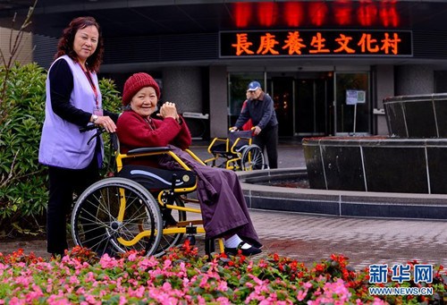 護(hù)理人員在長(zhǎng)庚養(yǎng)生文化村陪伴著老人。