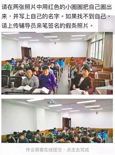 3月28日,在劉老師的課上,同學們收到了一份“簡單”的作業(yè):在老師上課期間拍攝的兩張照片中,分別找到自己的頭像并圈出提交,以此做為點名,如果沒有找到自己則需提交輔導員簽名的假條。