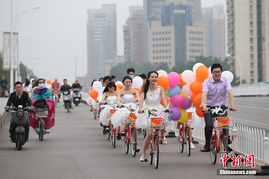 5月20日,南京90后小伙張龔亦騎著公共自行車迎接新娘徐思圓,在當(dāng)?shù)毓沧孕熊囆蜗蟠笫埂⒔K廣播主持人楊曉的策劃組織下,在“520”(我愛你的諧音)這一天用綠色環(huán)保、低碳出行的方式來表達(dá)愛情,表達(dá)對生活的這座城市的熱愛。泱波 攝