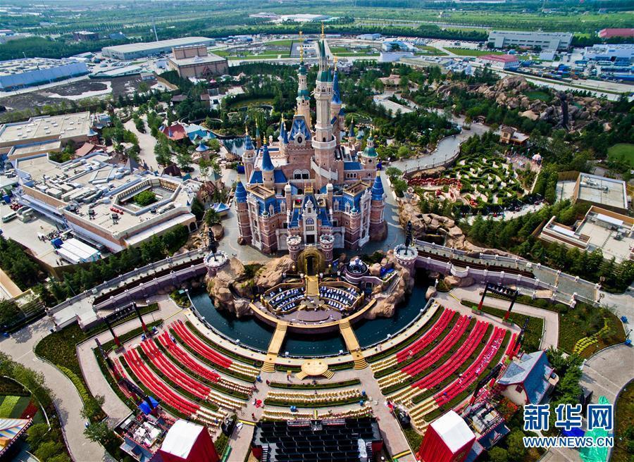 這是6月13日航拍的上海迪士尼開幕慶典主會場。從6月14日開始,上海迪士尼樂園將舉行為期三天的開幕慶典。日前,開幕慶典主會場“奇幻童話城堡”前金色的舞臺和觀眾席已搭設(shè)完成。 新華社發(fā) 鈕一新 攝 圖片來源:新華網(wǎng)