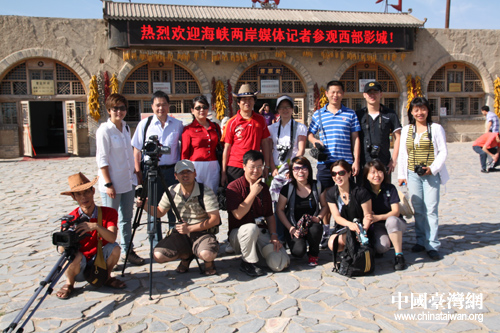 7月25日,海峽兩岸的記者在銀川鎮(zhèn)北堡西部影城合影留念。(中國臺灣網(wǎng) 楊永青 攝)