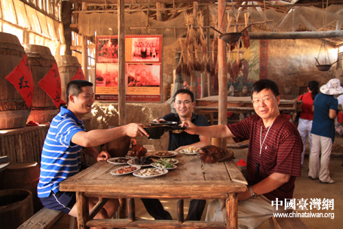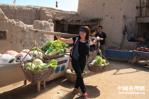 中國臺灣網(wǎng)7月26日銀川消息 挑菜、抬轎、打鐵,舉壇暢飲、把酒言歡,模仿著名影視劇中人物造型,兩岸媒體寧夏南部行的記者昨日上午在銀川鎮(zhèn)北堡西部影城暢快游玩,將《紅高粱》中張藝謀為鞏俐說戲的場景和周星馳在《大話西游》中的經(jīng)典造型風(fēng)趣地體現(xiàn)出來。