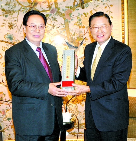 12月15日中午,江丙坤在臺(tái)北會(huì)見(jiàn)徐光春率領(lǐng)的河南省參訪團(tuán)一行。記者 陳 偉 攝