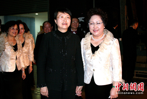 演出前,揚州市委書記王燕文(左)看望江丙坤的夫人陳美惠(右),預祝演出成功。崔佳明