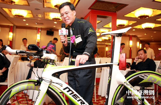 美利達(dá)公司總經(jīng)理許世彥興致勃勃的講解自己公司生產(chǎn)的多功能競(jìng)賽三鐵競(jìng)速車(chē)。(中國(guó)臺(tái)灣網(wǎng) 鐘寶華 攝)