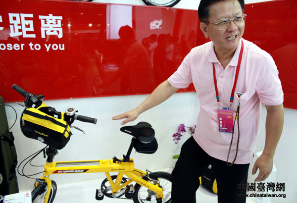 澎錸實業(yè)股份有限公司的黃中庸總經(jīng)理向民眾介紹公司產(chǎn)品——伸縮型單車。(中國臺灣網(wǎng) 鐘寶華 攝)