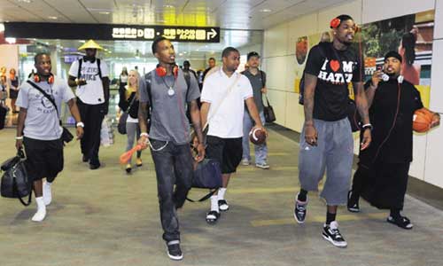 NBA球星包括活塞薩蒙斯(左一),灰熊塞比特(左二),雄鹿詹寧斯(左三),猛龍強森(右二)等人抵臺。圖片來源:臺灣《聯(lián)合晚報》
