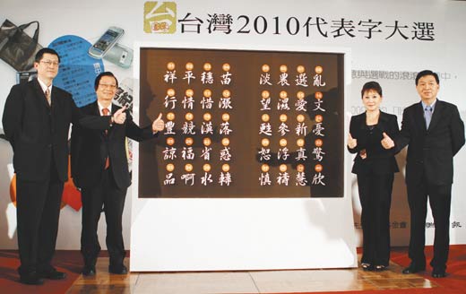 “臺(tái)灣2010代表字大選”活動(dòng),23日由“教育部長(zhǎng)”吳清基(左二)、聯(lián)合報(bào)總編輯羅國(guó)俊(左)、SOGO董事長(zhǎng)黃晴雯(右二)及律師黃茂德(右)共同公布40個(gè)候選字。