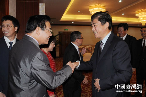 中共海南省委副書記于迅與臺(tái)灣無黨團(tuán)結(jié)聯(lián)盟主席林炳坤在一起交談。(海南臺(tái)辦唐小平 攝)