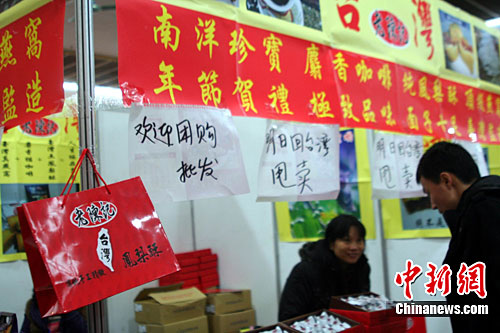 1月18日,在江西年貨節(jié)的臺灣食品展區(qū)內,鐘情傳統(tǒng)年貨的市民對這些從寶島帶來的特色食品感覺新鮮,但掏錢購買的顧客卻寥寥無幾。中新社發(fā) 劉占昆 攝