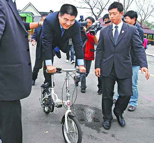 陳光標(biāo)一行人昨到竹山紫南宮拜拜,還一時技癢跟民眾借腳踏車耍特技。圖片來自網(wǎng)絡(luò)