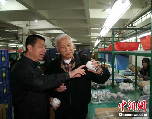 2月15日,在東山椿益塑膠制品有限公司生產(chǎn)車間,72歲的臺(tái)商、公司副董事長(zhǎng)呂文吉先生 (右)與技術(shù)員忙著嚴(yán)把產(chǎn)品質(zhì)量關(guān)。