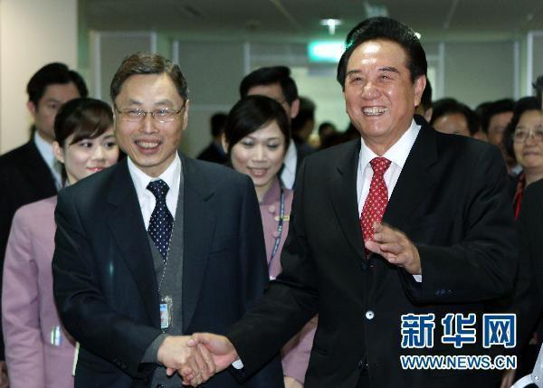 2月23日,海峽兩岸關(guān)系協(xié)會會長陳云林(前右)率領(lǐng)海協(xié)會經(jīng)貿(mào)考察團抵達臺北,開始在臺灣的參訪行程。;鶗倍麻L高孔廉(前左)到機場迎接陳云林一行。新華社記者宋立東攝