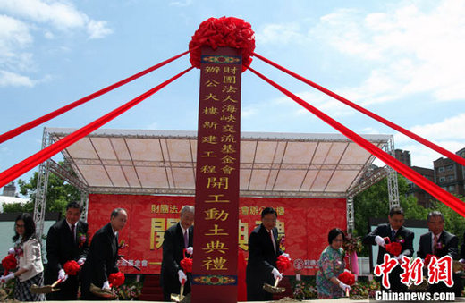 資料圖:2010年9月25日,臺灣;鶗罗k公大樓在臺北市中山區(qū)開工動土。圖為臺灣行政當局負責人吳敦義(左4)、;鶗麻L江丙坤(右4)、“陸委會主委”賴幸媛(左1)、辜振甫先生夫人辜嚴倬云女士(右3)與各界人士共同出席動土典禮,祝賀;鶗辛恕靶录摇。中新社發(fā) 劉舒凌 攝