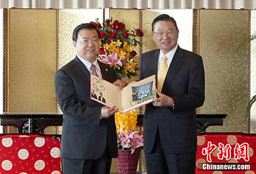 安徽省長(zhǎng)王三運(yùn)率領(lǐng)的“安徽經(jīng)貿(mào)文化寶島行”參訪團(tuán),4月18日午間抵達(dá)臺(tái)北,將展開為期8天的交流活動(dòng)。圖為王三運(yùn)(左)抵臺(tái)后,在臺(tái)北圓山飯店會(huì)見臺(tái)灣;鶗(huì)董事長(zhǎng)江丙坤。中新社發(fā) 路梅 攝