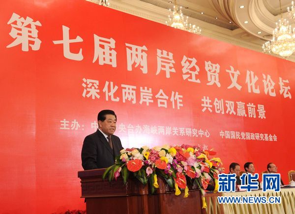 5月8日,第七屆兩岸經(jīng)貿(mào)文化論壇在四川成都閉幕。中共中央政治局常委、全國政協(xié)主席賈慶林和中國國民黨榮譽(yù)主席吳伯雄出席閉幕會(huì)。這是中共中央政治局常委、全國政協(xié)主席賈慶林致辭。 新華社記者 饒愛民 攝