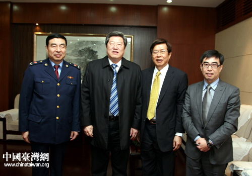 山東省政府特邀咨詢張建國(左二)、省工商局局長牛啟忠在晚會前與臺灣來賓合影。