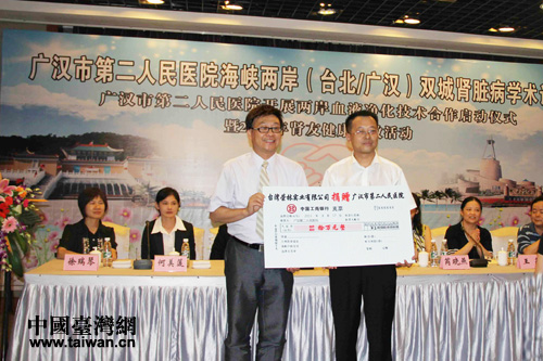 交流會(huì)上,臺(tái)灣專家新光醫(yī)院和上海市臺(tái)商協(xié)會(huì)向廣漢市第二人民醫(yī)院捐贈(zèng)了價(jià)值10萬元的血透耗材,同時(shí)舉行了“海峽兩岸血液凈化技術(shù)合作服務(wù)”的啟動(dòng)儀式。