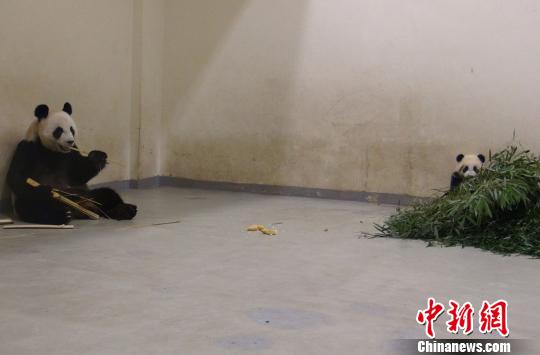 圖為“圓仔”咬竹葉,媽媽“圓圓”在吃晚餐。 臺北市立動物園供圖 攝