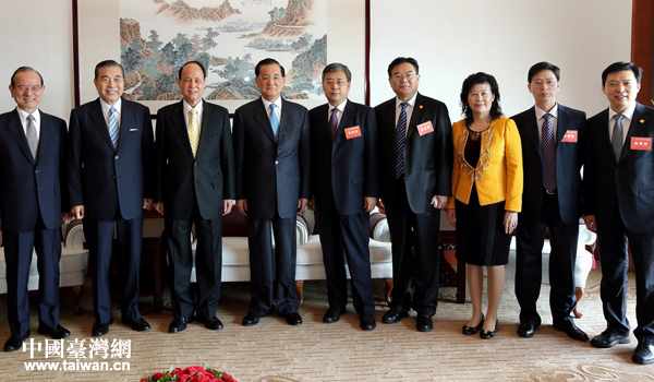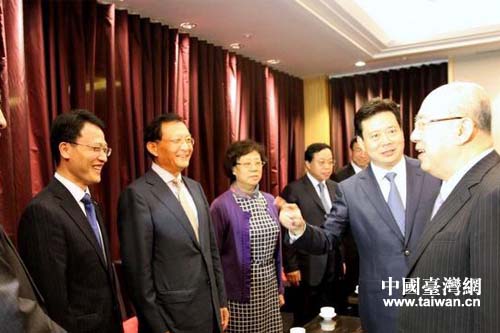 青島市委李群書記在臺北向吳伯雄榮譽(yù)主席介紹青島團(tuán)中的企業(yè)家。