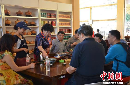 游客在臺(tái)灣美食工藝品館開心地泡茶。(劉雨 攝)