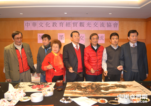 中國(guó)臺(tái)灣網(wǎng)2月13日臺(tái)北消息 2月12日,應(yīng)中華海峽兩岸企業(yè)交流協(xié)會(huì)邀請(qǐng),來臺(tái)出席第三屆高雄燈會(huì)節(jié)暨北京特色周活動(dòng)的大陸書畫名家與臺(tái)灣知名書畫家在臺(tái)北舉行交流筆會(huì)。臺(tái)灣中華文耀文教經(jīng)貿(mào)交流協(xié)會(huì)理事長(zhǎng)、臺(tái)灣畫家呂玉環(huán)主持筆會(huì),程茂全、張和平、王興家、慕云五等與臺(tái)灣畫院副院長(zhǎng)盧錫炯合作獻(xiàn)藝,共敘友情賀新春。(中國(guó)臺(tái)灣網(wǎng)北京通訊員 郭寧 王正智)