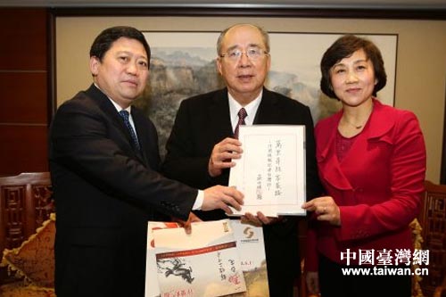 中國(guó)臺(tái)灣網(wǎng)2月13日臺(tái)北消息 2月11日下午,在臺(tái)北開(kāi)封街伯仲文教基金會(huì),中國(guó)國(guó)民黨榮譽(yù)主席、世界客屬總會(huì)總會(huì)長(zhǎng)吳伯雄親切會(huì)見(jiàn)了汴梁晚報(bào)記者臺(tái)灣行特別報(bào)道組。在欣然看完報(bào)道組帶去的開(kāi)封市委書(shū)記祁金立的親筆信后,吳伯雄表示,將全力幫助開(kāi)封成功舉辦世界客屬第27屆懇親大會(huì),并題詞“經(jīng)濟(jì)合作手?jǐn)y手文化交流心連心”。