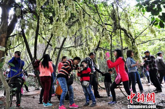 廣東東莞清溪鎮(zhèn)第四屆賞花行16日拉開帷幕,活動吸引了來自粵港臺兩岸三地的游客前來踏青賞花。圖為游客登山入林賞禾雀花!±瞰@ 攝