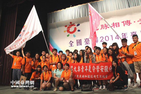 4日上午,全國臺聯(lián)2014年臺胞青年千人夏令營開營儀式在北京國際會議中心舉行。圖為臺灣青年在開營儀式后合影留念。(中國臺灣網(wǎng) 李徽 攝)
