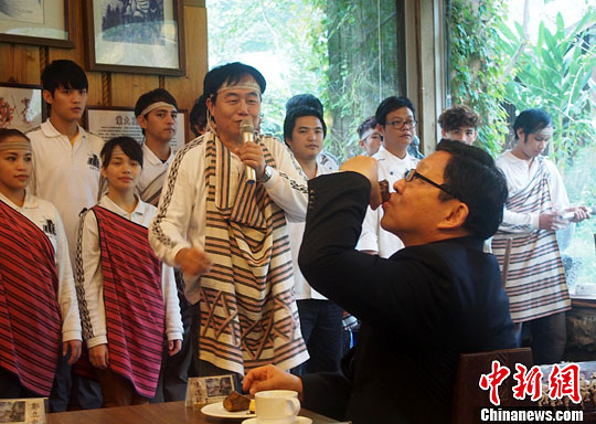 12月10日,海峽兩岸關(guān)系協(xié)會(huì)會(huì)長(zhǎng)陳德銘率“海協(xié)會(huì)經(jīng)貿(mào)交流團(tuán)”到訪花蓮太魯閣公園,并應(yīng)邀喝下臺(tái)灣少數(shù)民族的特色小米酒。中新社發(fā) 鄭巧 攝