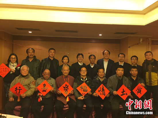 圖為陳逢顯(前排左3)與甘肅慶陽(yáng)文博參訪團(tuán)成員合影。前排左4為團(tuán)長(zhǎng)閻曉峰。全體人員手持書(shū)法家現(xiàn)場(chǎng)所寫(xiě)春聯(lián),有迎接新年到來(lái)的溫馨氣氛。