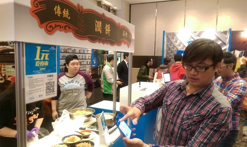 圖為工作人員現(xiàn)場(chǎng)演示如何在臺(tái)北夜市中使用支付寶結(jié)帳。