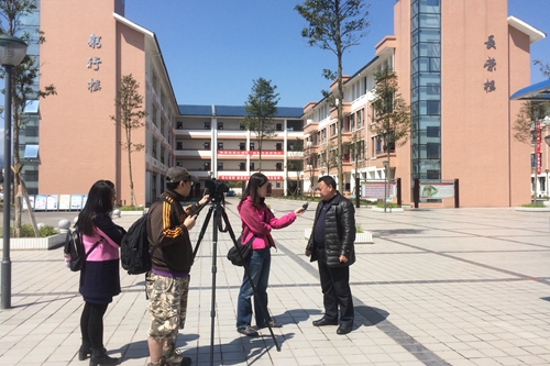 臺(tái)灣記者在臺(tái)灣同胞援建項(xiàng)目嚴(yán)道第一初級(jí)中學(xué)采訪。